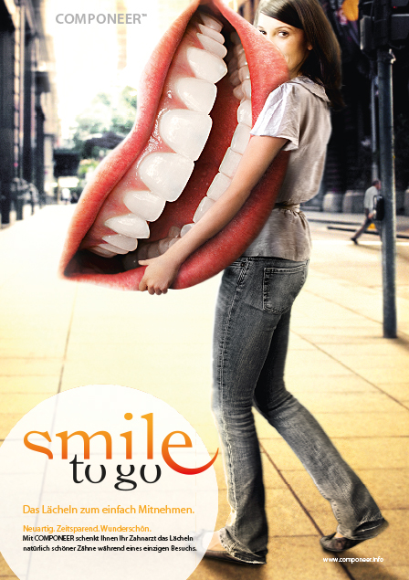 Die Agentur empfahl aufgrund der in ihrem Network weltweit durchgeführten Analysen COMPONEER™ als ästhetisches Kosmetikprodukt zu positionieren. Mit „Smile to go – das perfekte Lächeln zum einfach Mitnehmen“ gelang eine international stimmige Punktlandung. Der in Kombination mit einem überdimensionalen Lächeln gezeigte Claim verdeutlichte eindrücklich die Produkt-Benefits: Mit COMPONEER™ erhält der Patient in nur einer Sitzung sein neues und perfektes Lächeln.