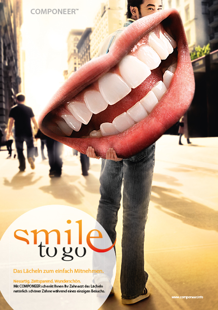 Die Agentur empfahl aufgrund der in ihrem Network weltweit durchgeführten Analysen COMPONEER™ als ästhetisches Kosmetikprodukt zu positionieren. Mit „Smile to go – das perfekte Lächeln zum einfach Mitnehmen“ gelang eine international stimmige Punktlandung. Der in Kombination mit einem überdimensionalen Lächeln gezeigte Claim verdeutlichte eindrücklich die Produkt-Benefits: Mit COMPONEER™ erhält der Patient in nur einer Sitzung sein neues und perfektes Lächeln.