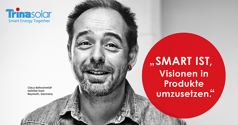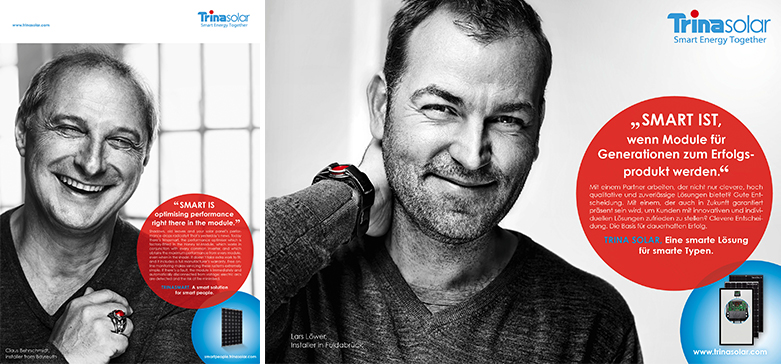 2 days before Chrismas the first contact, in February the closing of the contract for collaboration, in March strategic work: SWOT and Market analysis, new positioning and new brand steering wheel, and then in May the new campaign ready for the Intersolar fair: Wächter`s brandguards, advertising and online people, who all have long and wide experience in the solar market, were real fast when developing the new European campaign for Trina Solar, the chinese producer of premium quality solar modules. Trina is a successfull player in the strongly regulated European solar market . Wächter created a testimonial campaign with installers who as ignited brand ambassadors sing the song: Smart modules for smart people.