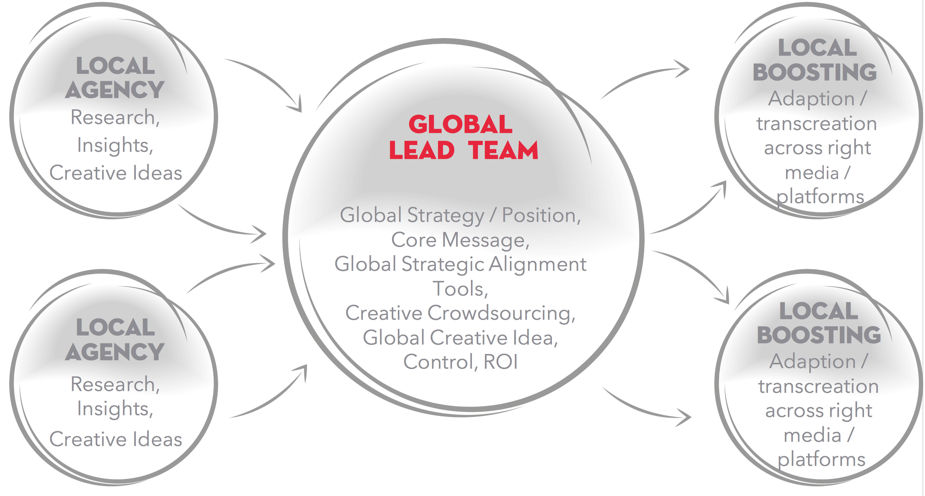 Wenn Sie solche Massnahmen ergreifen nähern Sie sich dem Hybrid-Modell an. Bei einem solchen binden wir sowohl unsere Partneragenturen als auch die Länderorganisationen unserer Kunden schon ganz früh in die Markenstrategie-und Kampagnenentwicklung ein und delegieren dann die Umsetzung weitgehend an die lokalen Organisationen.