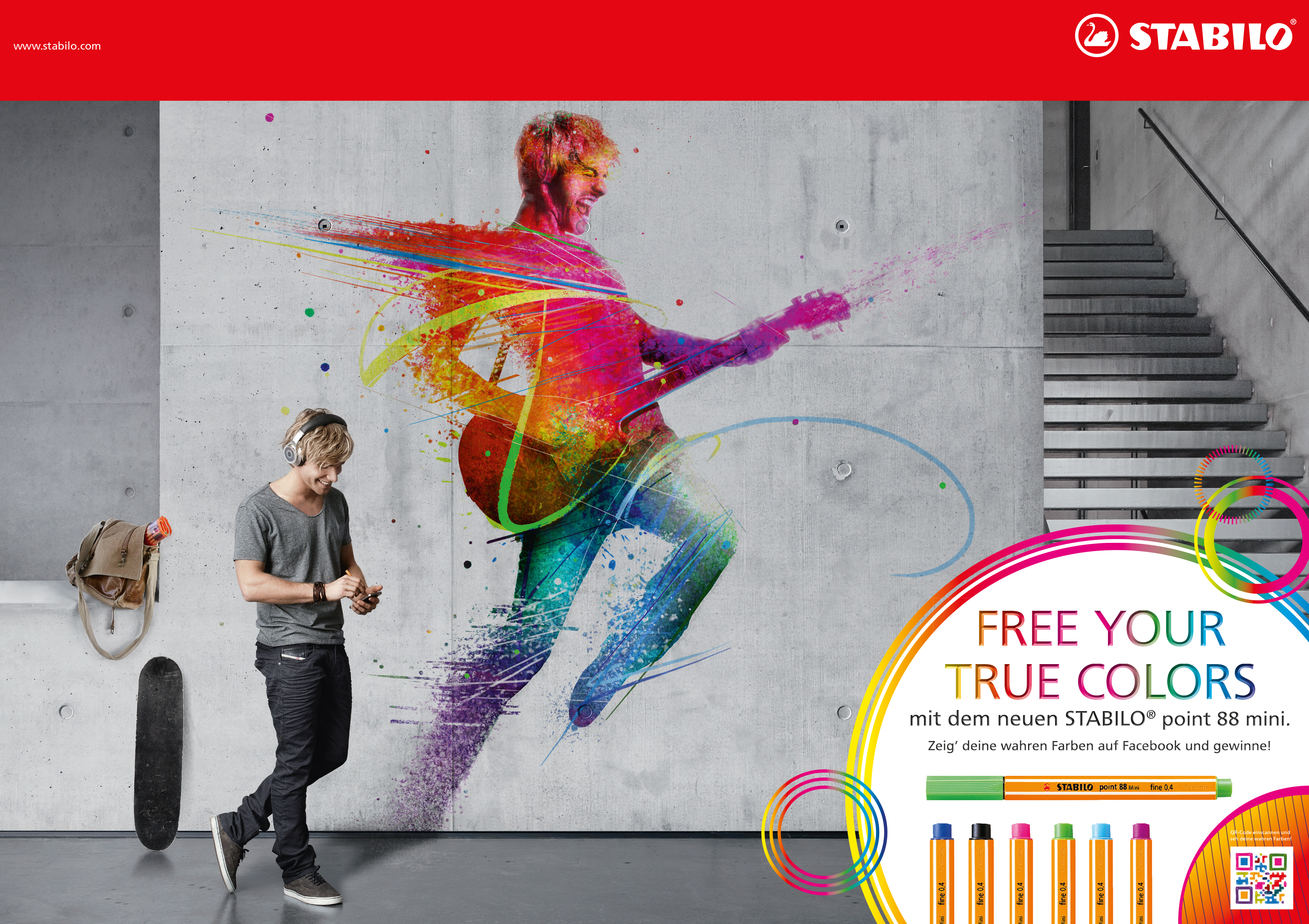 Free Your True Colours! Unter dieses Motto stellt Wächter & Wächter die neue Dachkampagne für Stabilo. Das Ausleben von Kreativität ist für viele Menschen jeden Alters ein wichtiger Teil ihres Lebens und ein wichtiger Teil ihrer persönlichen Identität. Die Marke Stabilo steht für enorme Vielfalt und Buntheit und ermöglicht den Menschen die Entfaltung und das Ausleben eben dieser Kreativität. Lebe aus, was in Dir steckt! Visualisiere Deine Ideen und Träume! Zeige Dein wahres Ich! Free your true colours! Genau dazu zu inspirieren und anzuregen ist die Idee des Kampagne, die neben klassischer Werbung vor allem durch begleitende Aktionen im Web (Website und Facebook) und massive POS-Präsenz begleitet wird. Als kreative Inszenierung des Markenkerns ist diese Kampagne längerfristig angedacht.
